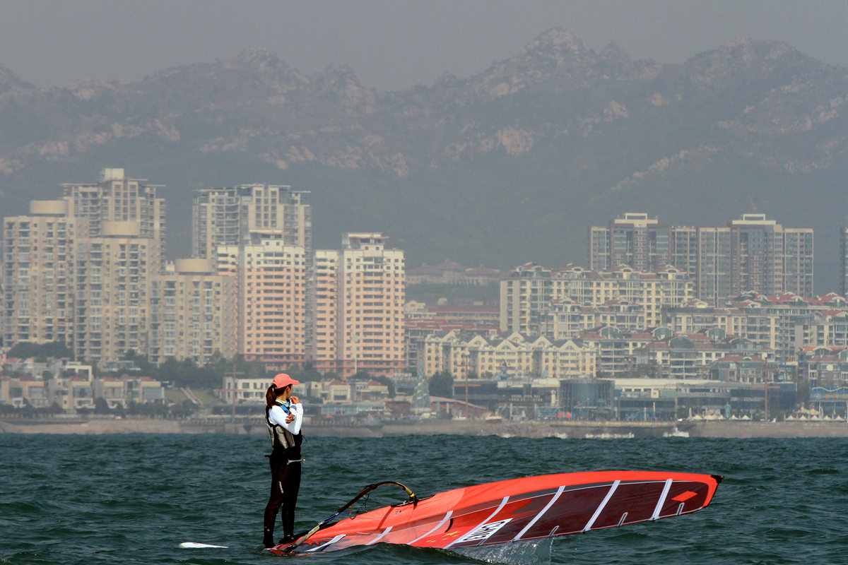 在国际帆船的比赛中,一名青岛籍国家队队员在眺望家乡的比变化。